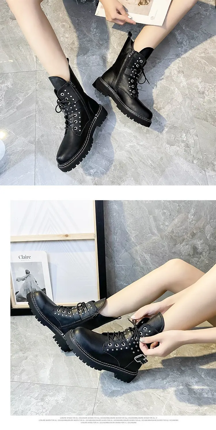 Женские кожаные ботильоны на платформе размера плюс, Новая модная женская массивная обувь на шнуровке, женские повседневные ботинки с заклепками и ремешком с пряжкой