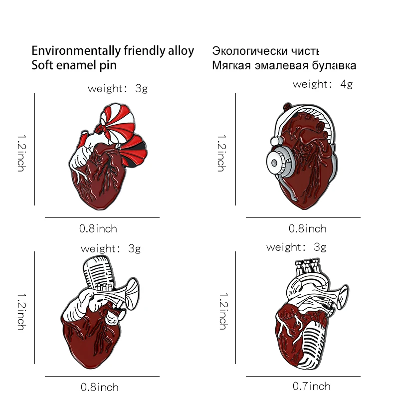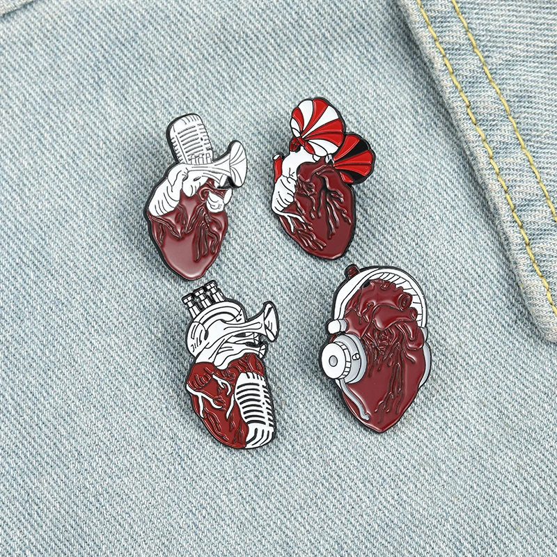 Музыкальная булавка в форме сердца, анатомическая булавка в форме человеческого сердца, фонограф, гарнитура с микрофоном, мужские и женские броши в стиле панк и готики, ювелирные изделия