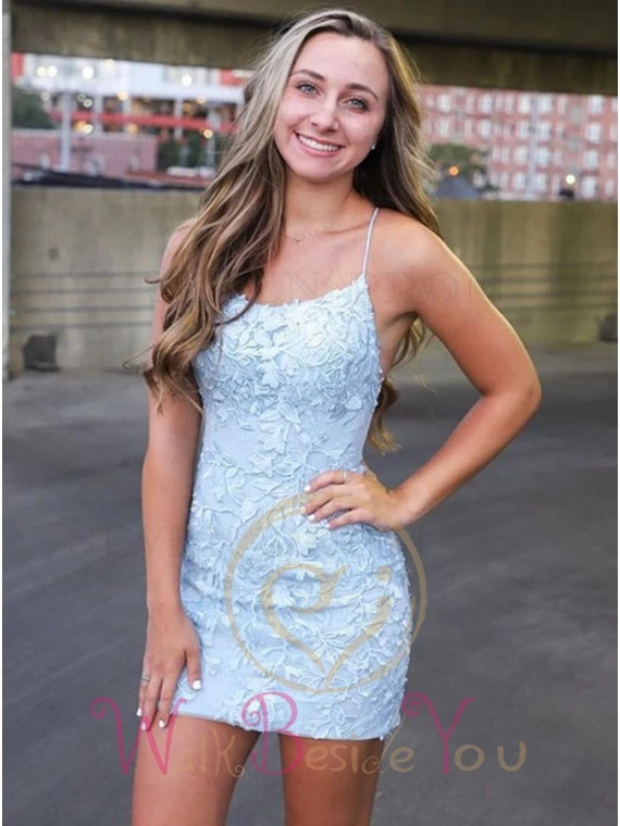 Платья для выпускного вечера, 2021, облегающее платье на тонких бретельках, светло-голубое обтягивающее короткое платье для выпускного вечера, с кружевные аппликации Формальные