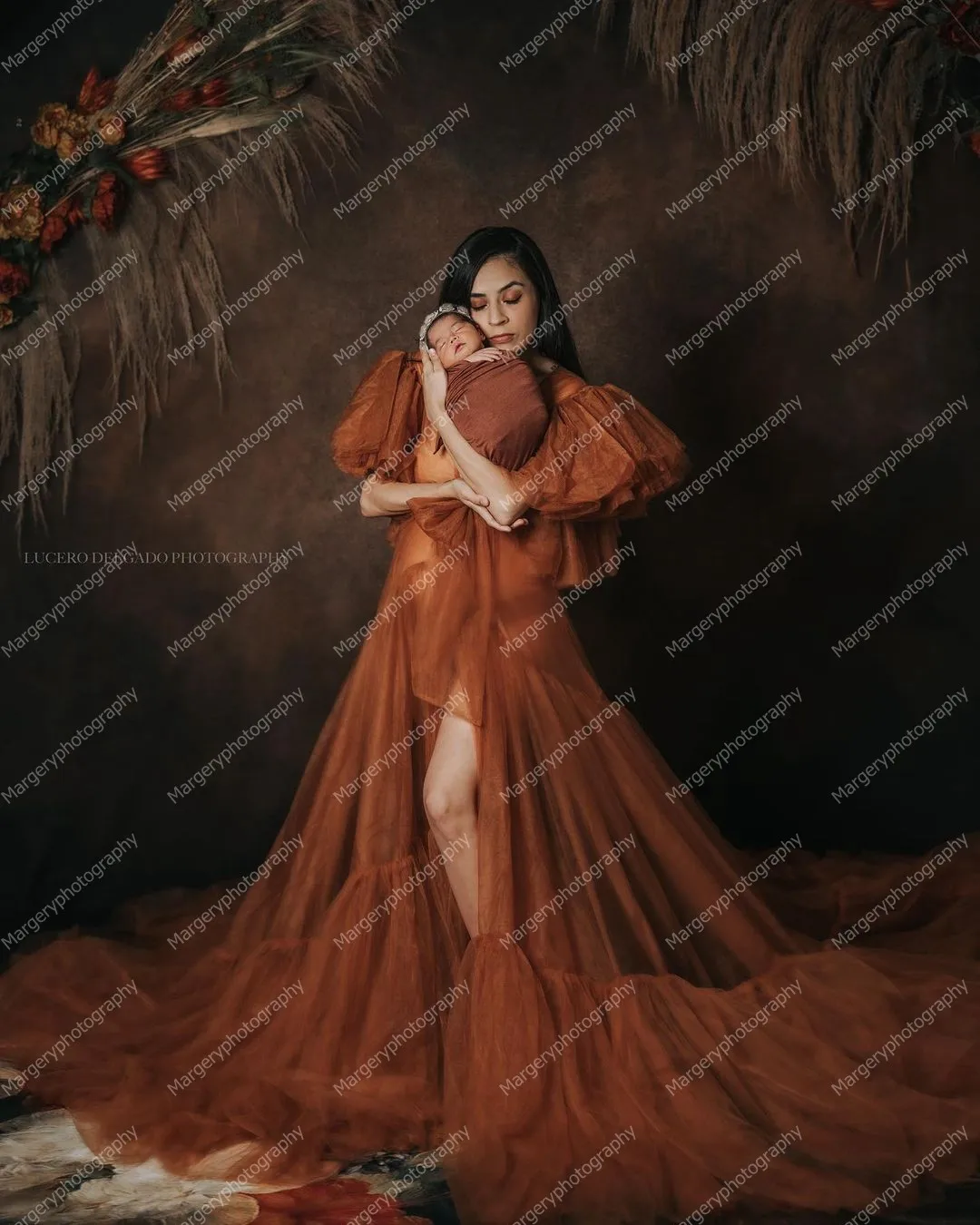Элегантные тюлевые халаты для беременных со шлейфом, пышные рукава, передний разрез, пушистые длинные платья для беременных