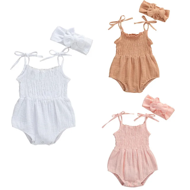 Летний комбинезон Lioraitiin для новорожденных девочек, однотонный комбинезон без рукавов из хлопка и льна, Комбинезоны на бретелях, повязка на голову, одежда из 2 предметов