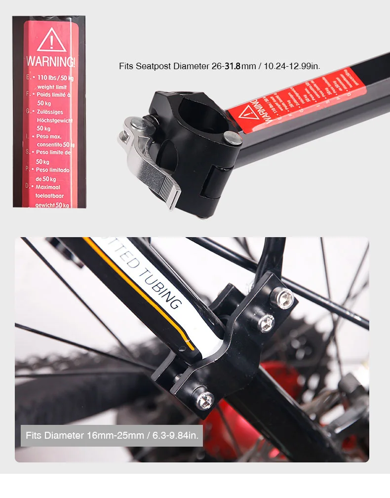 • Прочная конструкция из алюминиевого сплава, черное покрытие;• Высота и длина регулируется; Подходит для велосипедов 20-29 дюймов;• Быстросъемное крепление для стойки сиденья и крепление винта к раме для надежного позиционирования;• Болты с шестигранной головкой для фиксации и крепления;• Поставляется с инструментами для крепления.