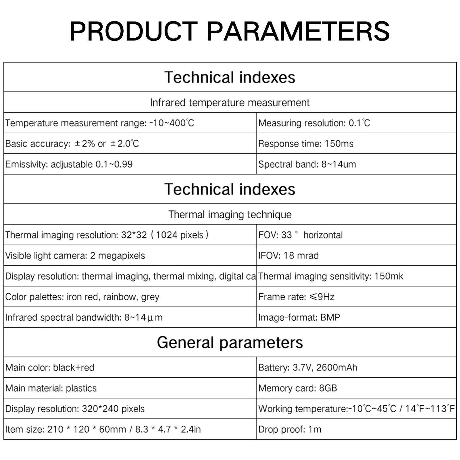 NF-521 имеет функцию тепловизионной съемки и может отображать на экране горячие и холодные пятна, что позволяет пользователям более эффективно регулировать изменения температуры объекта. Это позволяет вам быстро заблокировать целевую зону. Стандартная карта памяти 8 Гб может сохранять большое количество изображений и данных и генерировать высококачественные инфракрасные изображения, что является полезным инструментом для устранения неисправностей. Особенности: Высокое разрешение. Видисветильник 2 миллиона пикселей, четко видны 1024 пикселей тепловизионной съемки. 3 режима цветопередачи. Инструмент содержит 3 цветовых палитры: Железный красный, Радужный, серый. Выберите подходящую цветовую палитру, чтобы показать детали целевого объекта. Две функции сочетания изображений. Контурная линия и Тепловизионная визуализация-плавное отображение, видисветильник и Тепловизионная съемка. Этот прибор поддерживает два визуальных режима переключения, которые можно сравнить в соответствии с двумя диаграммами измерений, чтобы найти точку неисправности. Это хороший выбор для электриков и техников по обслуживанию и может использоваться для быстрого поиска проблемной зоны. Хранилище изображений большой емкости. Стандартная мини-карта памяти 8 Гб с большим объемом может хранить различные изображения измерений. USB для быстрого чтения изображений. Снятые фотографии, сохраненные в инструменте, можно просматривать и экспортировать, подключившись к компьютеру, что удобно и быстро. Характеристики: Технические индексы: Инфракрасное измерение температуры Диапазон измерения температуры: -10 ~ 400 ℃ Базовая точность: ± 2% или ± 2,0 ℃ Коэффициент излучения: регулируемый 0,1 ~ 0,99 Разрешение измерения: 0,1 ℃ Время отклика: 150 мс Спектральный диапазон: 8 ~ 14 мкм Техника тепловизионной съемки Разрешение тепловизора: 32*32(1024 пикселей) Камера с видимым светильник Том: 2 мегапикселя Разрешение дисплея: тепловизор, тепловое смешивание, цифровая камера Цветовые палитры: Железный красный, Радужный, серый Инфракрасная спектральная Пропускная способность: 8 ~ 14 мкм FOV: 33 ° по горизонтали Ифов: 18 мрад Чувствительность тепловизора: 150 МК Частота кадров: ≤ 9 Гц Формат изображения: BMP Общие параметры Разрешение дисплея: 320*240 пикселей Аккумулятор: 3,7 в, 2600 мАч Карта памяти: 8 Гб Рабочая температура:-10 ℃ ~ 45 ℃ / 14 ℉ ~ 113 ℉ Защита от падения: 1 м Основной цвет: черный + красный Основной материал: пластик Размер изделия: 210*120*60 мм/8,3*4,7 * дюйма Посылка: 230*140*80 мм/9,1*5,5 * 3.1in Вес посылка: 500 г/фунта Упаковочный лист: 1 * тепловизор 1 * USB кабель 1 карта памяти 1 * Руководство пользователя