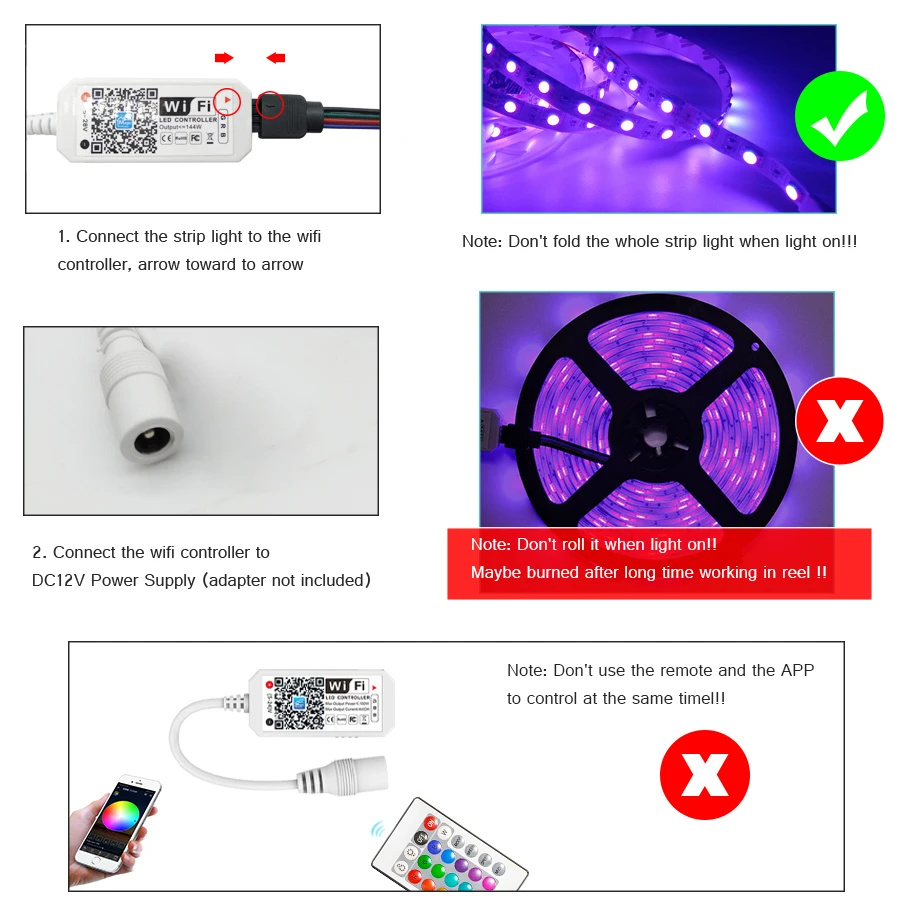 1. Убедитесь, что стрелочный знак «→» (на гнездовом соединителе) и знак «12 В» (на ленточном светильник) находятся на одной стороне. Если нет, это не сработает. Отключите, поверните и повторно подключите.