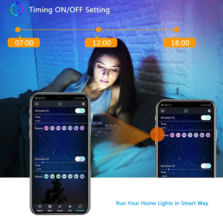 2. Светодиодные ленты с таймером, вы можете регулировать яркость светодиодной ленты в соответствии с различными местами, светодиодные полосы имеют функцию памяти, когда полоски снова используются, они запоминают последние настройки режима без повторной настройки, с помощью смарт-приложения вы можете испытать функцию синхронизации, автоматически включать и выключать в заданное время, можно выбрать 28 динамических режимов, вы также можете сделать свой уникальный цветДоступно несколько сцен