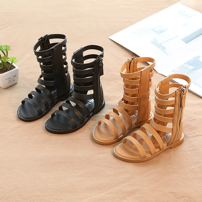 Сандалии для девочек, летняя модная однотонная обувь принцессы в римском стиле, пляжные босоножки средней высоты на плоской подошве, размеры 21-30 SMG089
