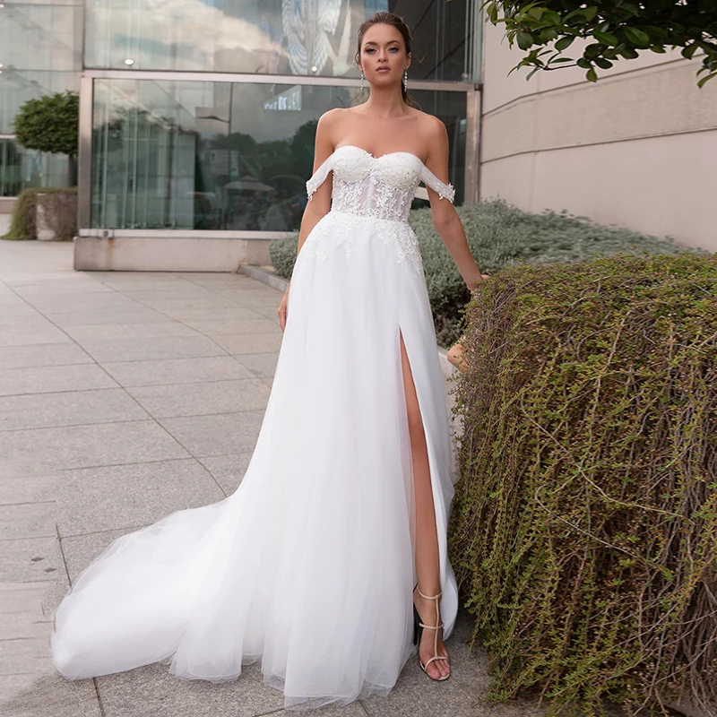 Платье свадебное кружевное с открытыми плечами и открытой спиной