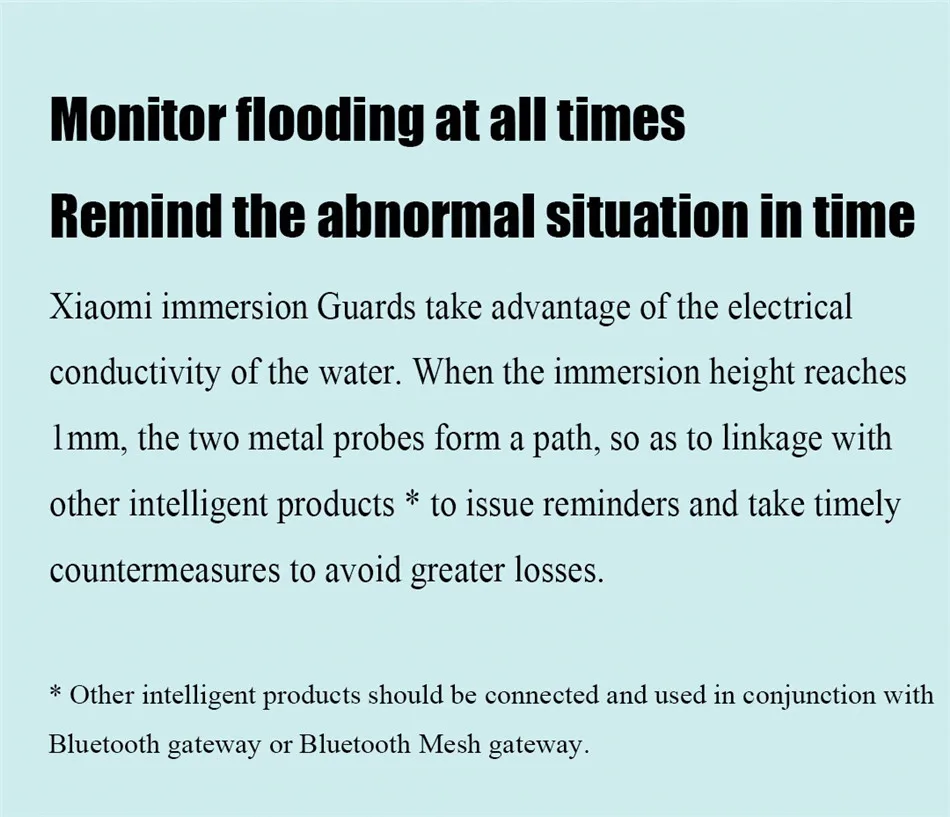 Xiaomi умный Wifi датчик обнаружения воды умный детектор воды беспроводной Ip67 с приложением Mijia детектор утечки сигнализации для домашнего сейфаОсобенности:-【Emind ненормальная ситуация во времени 】Xiaomi immersion Guards использует электрическую проводимость воды. Когда высота погружения достигает 1 мм, два металлических зонда образуют путь, чтобы связываться с другими интеллектуальными продуктами *, чтобы выдавать напоминания и принимать своевременные контрмеры, чтобы избежать больших потерь.-【Local remote также alert】Защита от погружения в воду Xiaomi может взаимодействовать с динамиками Xiaoai. При обнаружении переливания воды динамики Xiaoai будут воспроизводить звуковые напоминания, а мобильный телефон также получит уведомление о наводнениях.-【Напоминание о низкой мощностиЧерез приложение Mijia информацию, такую как журнал наводнений, мощность батареи и сила сигнала стоматологического шлюза, можно проверить в любое время *. Когда защита погружения в просо находится в состоянии низкой мощности, это также напомнит о замене батареи.Характеристики:Бренд: XiaomiМодель продукта: SJWS01LMРазмер изделия: 50x17 ммТип батареи: CR2032 (с)Вес нетто: 23 гРабочий размер: 0 ℃ ~ 55 ℃Класс защиты: IP67Посылка включает в себя:1 Умный датчик утечки воды Xiaomi