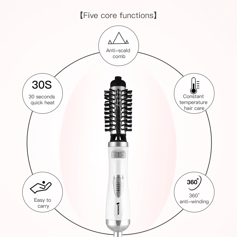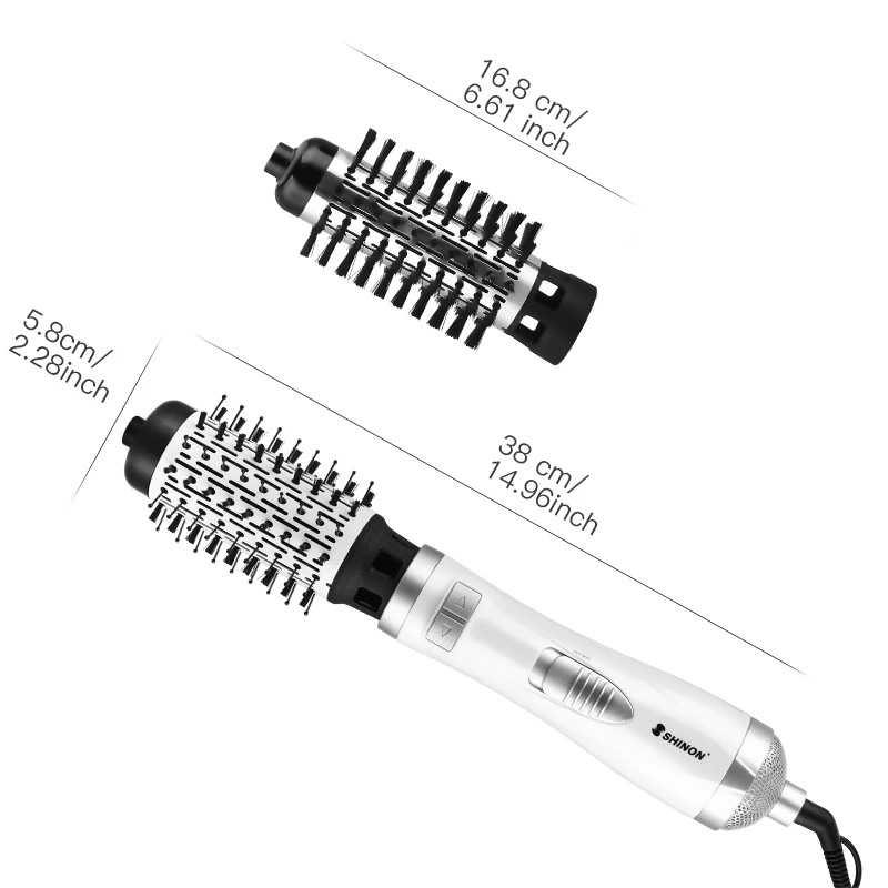 7. Две сменные электрические щетки и номинальная мощность 1000 Вт позволяют быстро высушить волосы, легко укладывая волосы.