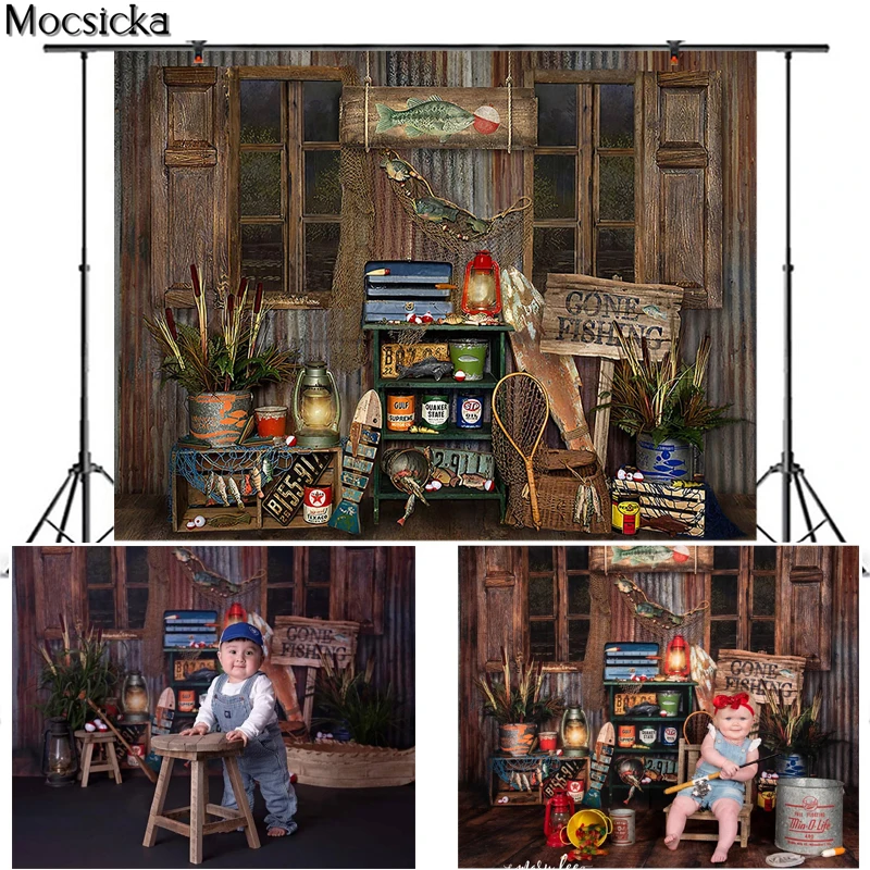 Фон для фотосъемки на день рождения с изображением рыбалки мальчика девочки рыболовное снаряжение коричневая доска Детский портрет торт разбивной фон для фотостудии