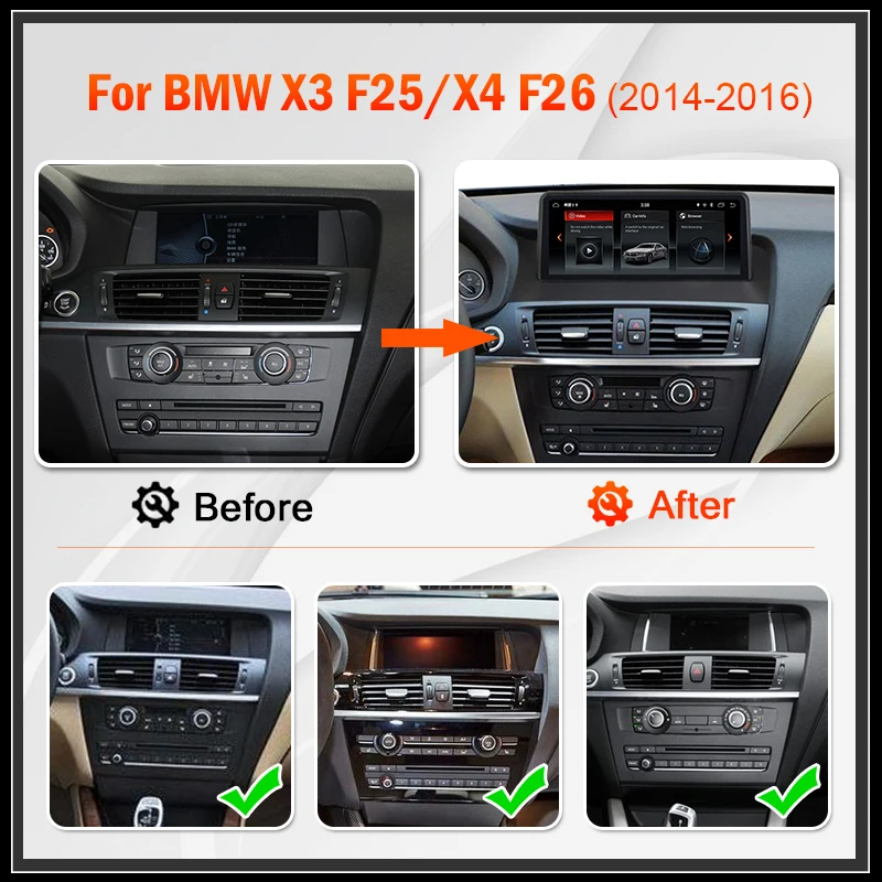 Применимые модели и годы:Для BMW X3 F25(2010-2013) оригинальная система CICДля BMW X3 F25(2013-2017) оригинальная система NBTДля BMW X4 F26(2014-2017) оригинальная система NBTХотя мы приложили все усилия, чтобы обеспечить совместимость этого устройства с перечисленными автомобилями, пожалуйста, проверьте год, размеры и форму центральной консоли вашего автомобиля перед покупкой.1.Зарубежный склад
