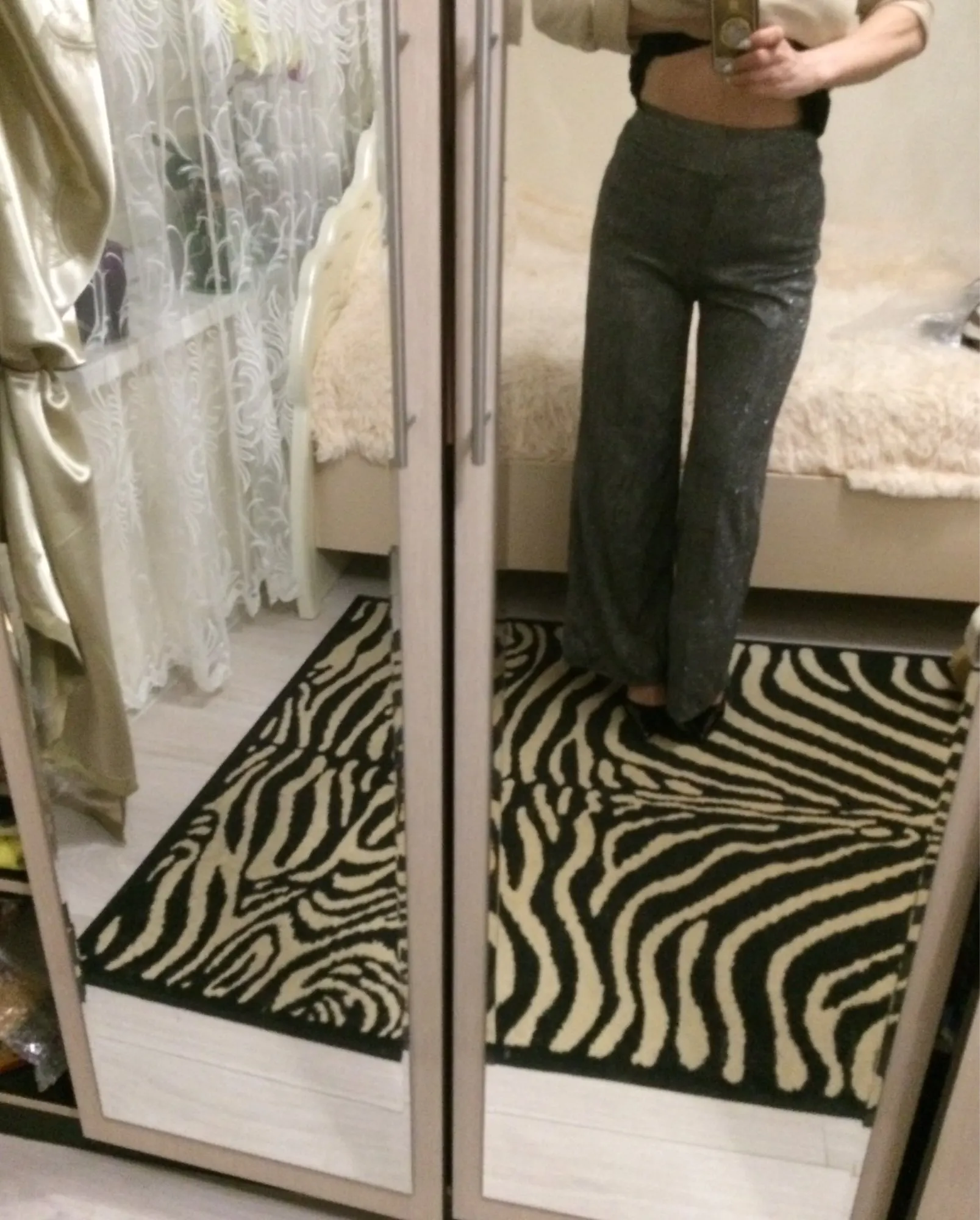 2021 серебряные блестящие широкие брюки с высокой талией и блесткам...