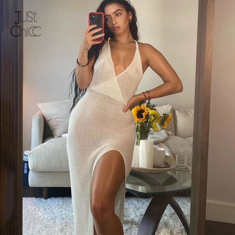 Прозрачное сексуальное платье Justchicc с V-образным вырезом, летнее женское платье средней длины с вырезом на спине, 2021 вечерние нее платье без рукавов