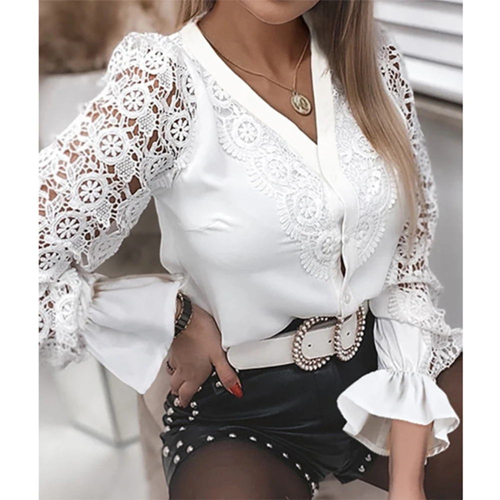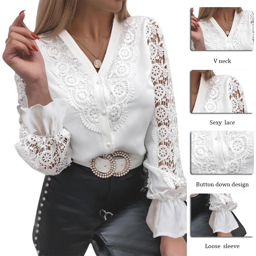 Женская кружевная блузка составного кроя с вырезом лодочкой, с длинным рукавом, на пуговицах, сетчатая дизайнерская блузка, Весенняя Модная белая винтажная рубашка