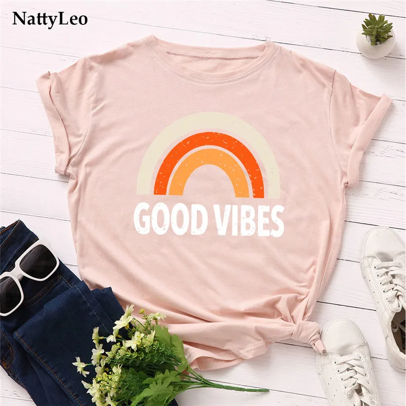 Женская футболка с принтом Good Vibes, футболка из 100% хлопка с круглым вырезом и коротким рукавом, летние женские футболки, футболка с графическим принтом в стиле Харадзюку