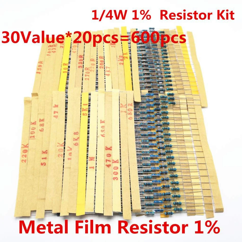 600 шт. 30 значений набор резисторов для металлической пленки 10R-1M пакет резисторов 0,25 Вт 1%