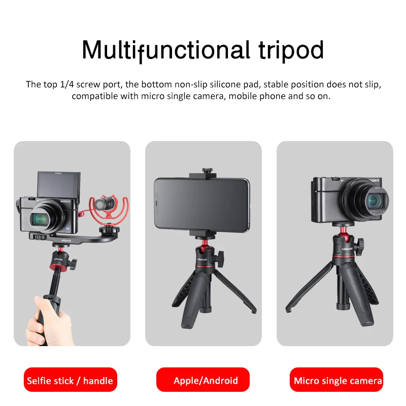 1. MT-08 настольный штатив, многофункциональный и практичный, портативный и удобный.2. Может свободно переключаться в режиме штатива и селфи-палки в соответствии с требуемой сценой.3. С использованием нескользящей Силиконовой ручки для обработки текстурой, противоскользящей и удобной на ощупь одновременно.4. Может быть плотно зафиксирован при хранении и не распущен. Три части сжатия, гибкие свободно.5. Изготовлен из высококачественного АБС-пластика и алюминиевого материала, прочный, прочный и длительный срок службы.