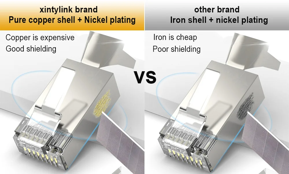 1. Лучшее сопротивление окислению после никелирования2. Чистая медь-лучшее Экранирование от внешних помех, делает скорость сети стабильной