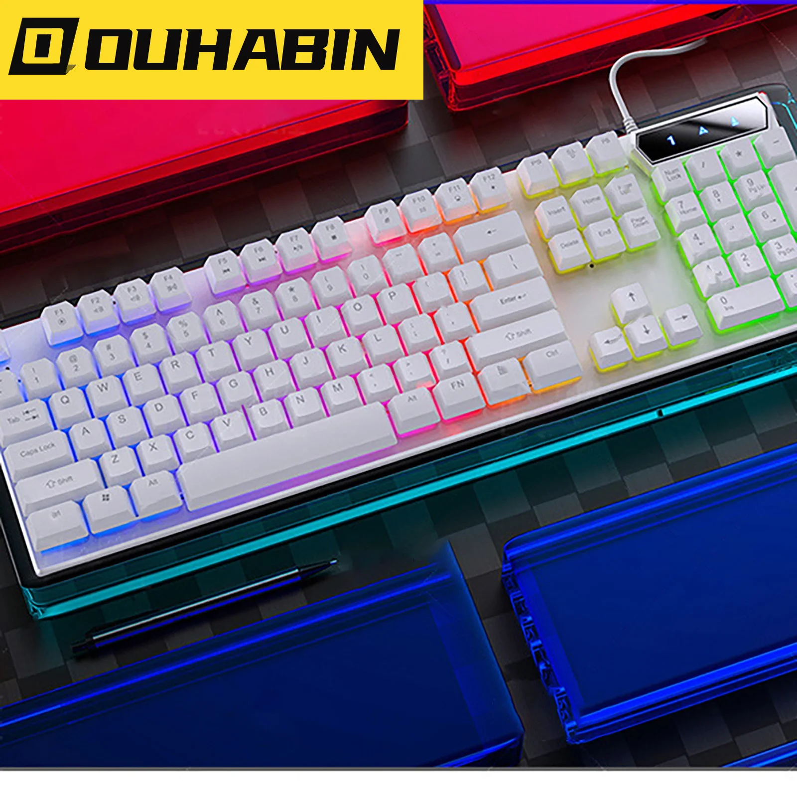 Особенность:1. Колпачки для ключей в Стиле Подвески, водонепроницаемые и пыленепроницаемые, легко снимаются для тщательной очистки для более длительного времени работы.2. Модный стиль и изогнутый дизайн клавиш обеспечивает супер прохладное механическое ощущение.3. Корпус из утолщенного АБС-материала, прочный и износостойкий.4. Эффекты подсветки радужного цвета: приносит крутые ощущения от игры, в частности, увеличивает игровые клавиши с эффектом подсветки и легко набирается в темное время суток.5,16 крепежных винтов полностью покрыты, что более Долговечно, чем обычные клавиатуры! Оснащен 4 дренажными отверстиями, регулируемой двойной поддержкой стопы + двойными нескользящими наклейками для ног.Спецификация:Цвет: черный/белыйРазмер клавиатуры: около 442x134x22ммСрок службы кнопки: 5 миллионов разПосылка входит:1 x Проводная клавиатура