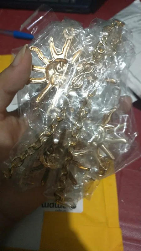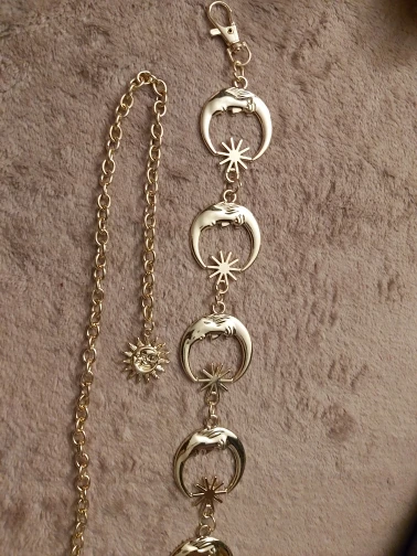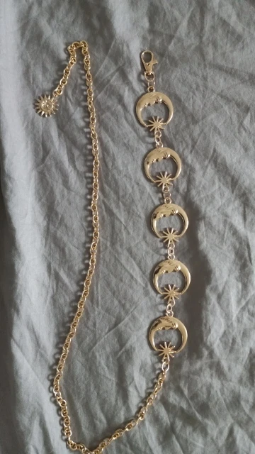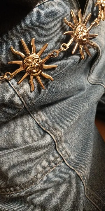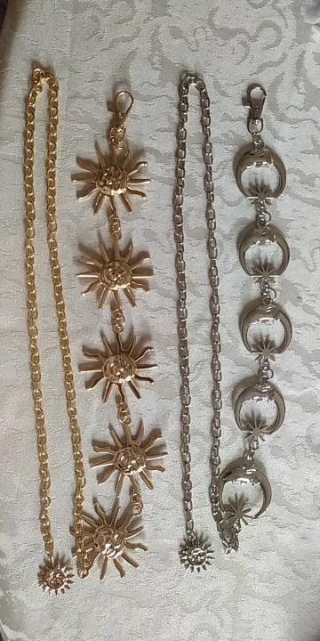 заказала два пояса, оба соответствуют описанию, налезает на каждую,но! боюсь,что метал может окислиться или окраситься со временем, так что покрою сразу бесцветным лаком солнышки и месяцы)