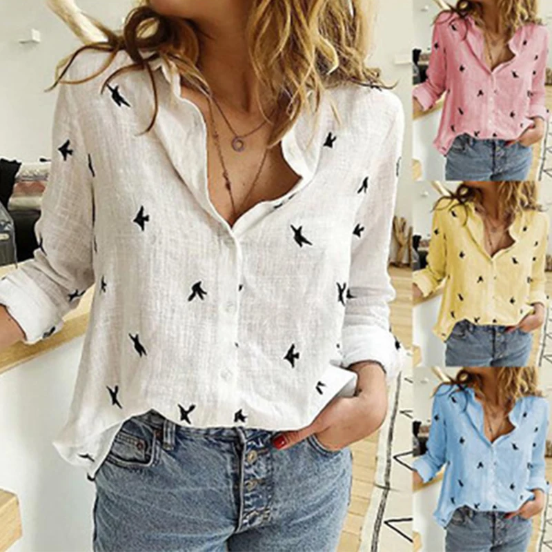 S-5xl Женская хлопковая рубашка с отложным воротником и принтом, повседневный Топ с длинным рукавом, размера плюс, белая, весна-лето