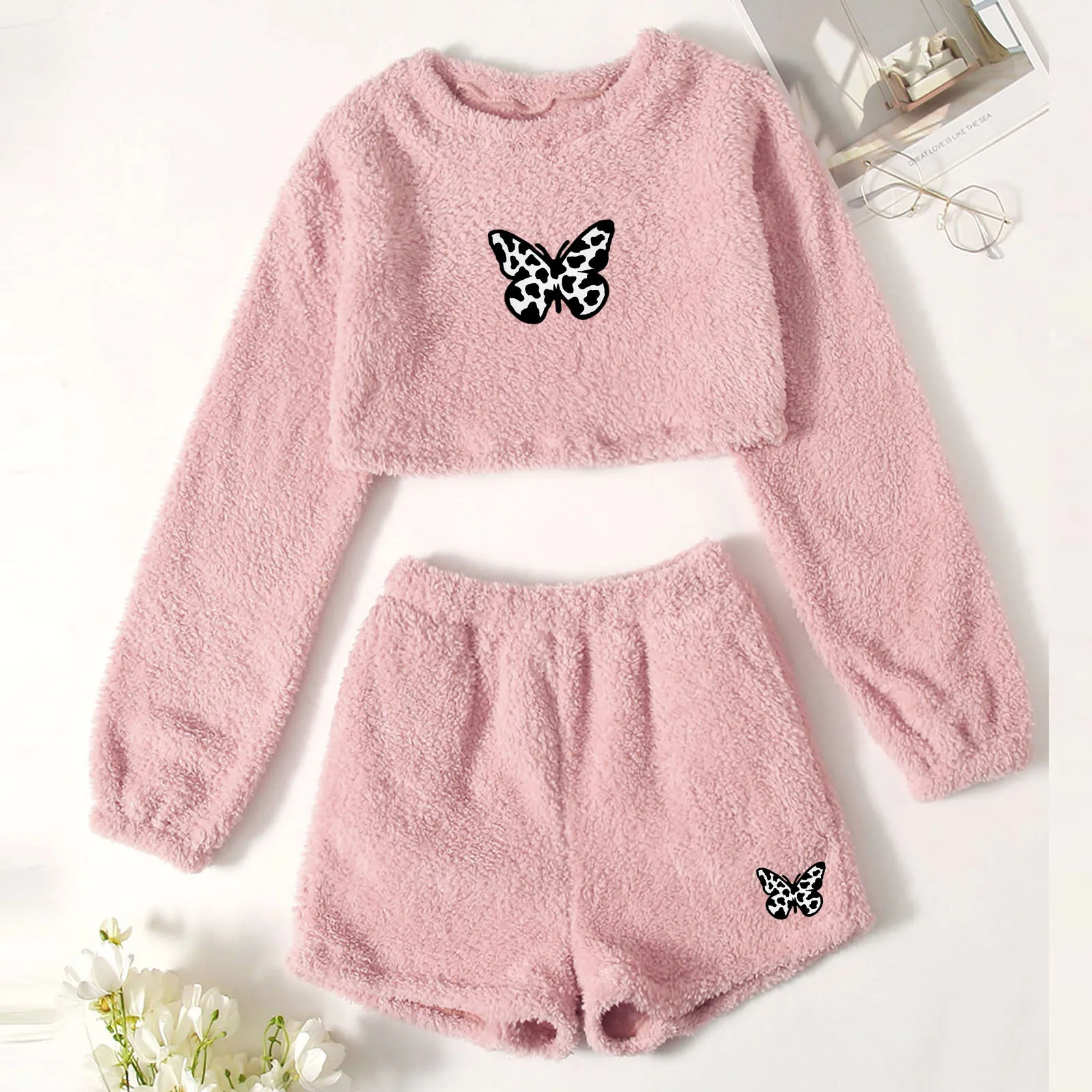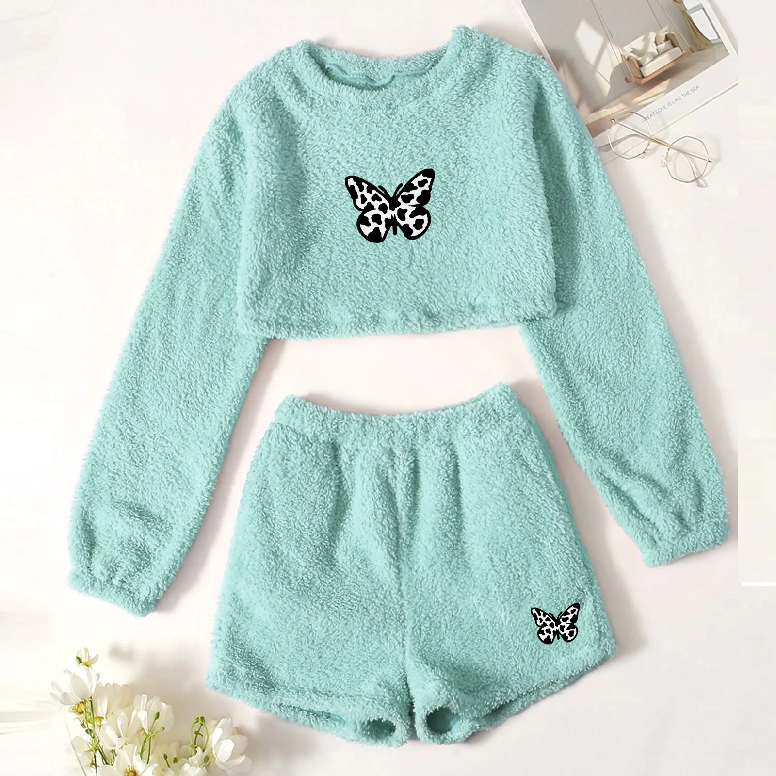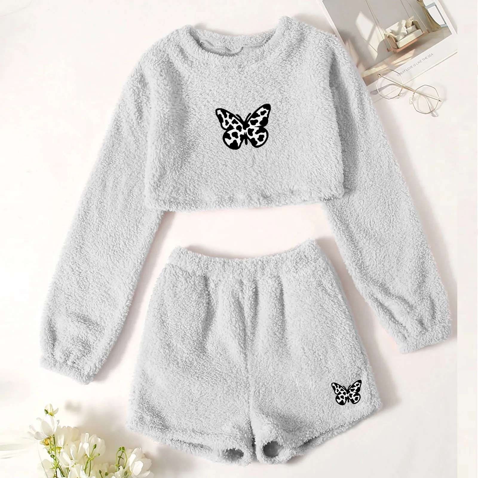 Пижама с принтом бабочки, женские комплекты, пуловер с длинным рукавом и круглым вырезом, топы для сна + шорты, комплект домашней одежды