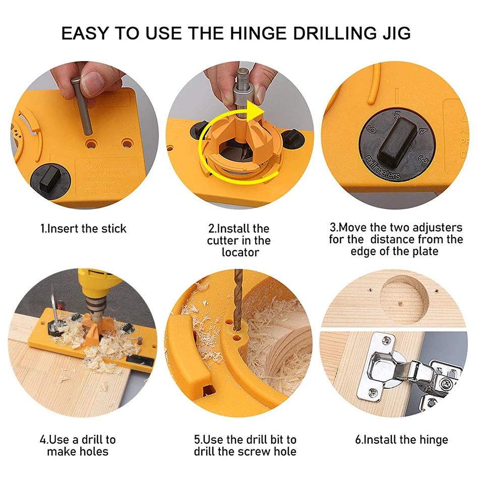 Наш зажим 35 мм изготовлен из инженерного пластика, это набор направляющих инструментов для очень точной установки скрытых петель. Зажим шарнира поставляется с регулируемой конструкцией циферблата, ограничивается 3, 4, 5 и 6 миллиметрами, очень точный и делает измерения легкими. Скрытый зажим шарнира подходит для 35 мм шарниров, а также доступен с 26 мм шарнирами и легко регулируется под многие двери. Сверло острое, легко просверливает новые отверстия с минимальными усилиями и без пробоев или сколов. Простота использования с любым сверлом, вам не нужно быть хорошо оборудованным деревообработчиком, чтобы установить эти петли. Идеально подходит для любого мастера, которому нужно делать петли.