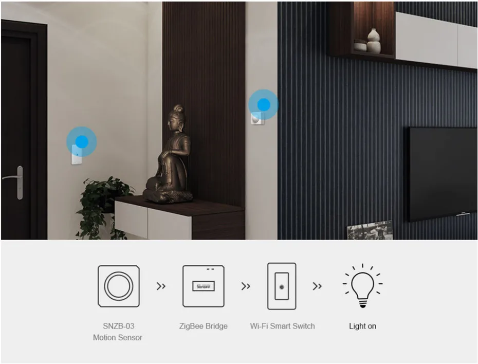 Работает с датчиком движения SONOFF SNZB-03, чтобы ваш светильник гостиной автоматически включался, когда вы входите в гостиную вечером, без темноты перед вами.