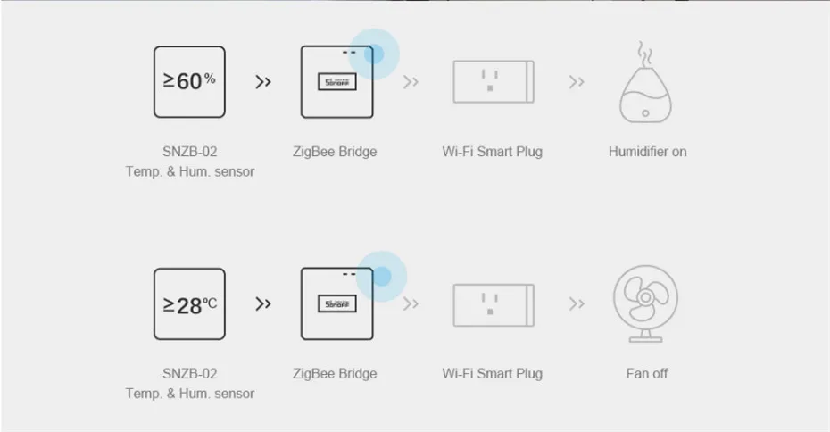 Подключите мост к SONOFF SNZB-02 Tem.& Hum. Датчик для определения температуры и влажности в реальном времени в вашем доме, затем вы можете включить/выключить вентилятор или увлажнитель воздуха, чтобы изменить соответствующий уровень.
