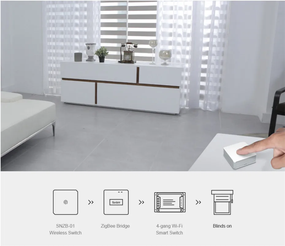 Сопряжение SONOFF SNZB-01 беспроводным переключателем и мостом, вы можете управлять подключенными жалюзи через переключатель в любом уголке дома.