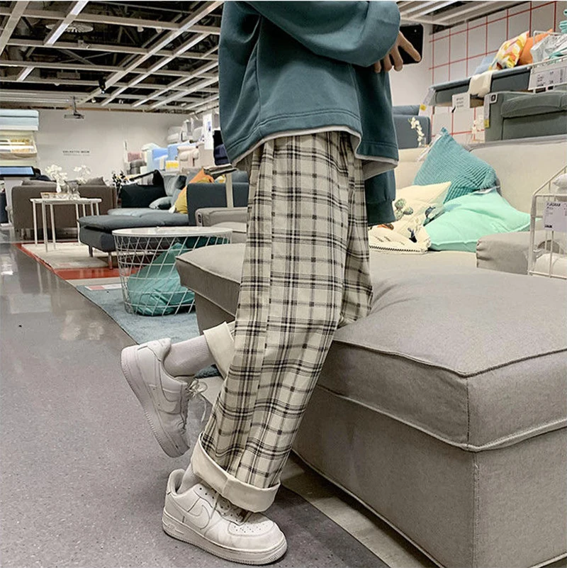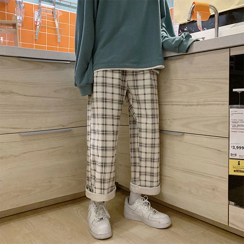 Женские брюки весна и осень, новые корейские клетчатые брюки, свободные прямые широкие брюки, винтажные уличные брюки в стиле Харадзюку
