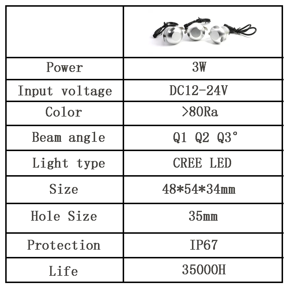 Мощность: 3 ВтЛюмен: 280 лмВходное напряжение: DC12-24VСветильник (красный, зеленый, синий) Угол пучка: Q1/Q2/Q3Класс защиты: IP 67Основной материал: алюминийРазмер корпуса: d48мм x54ммКабель: DC12V-24V с водонепроницаемым наконечником 36 смРабочая температура: -25 °C ~ + 45 °CГарантия: 3 года с CE и ROHS, срок службы чипа 35 000 часовЦветовая температура: теплый белый (2700-3000K), натуральный белый (4000-4500K), холодный белый (6000-6500K)Использование: много видов вне дверь светильник ing, такие как дорожный боковой светильник, квадраты светильник, дорожки светильник, сад светильник, мосты светильник и другие открытый Венера светильник ing