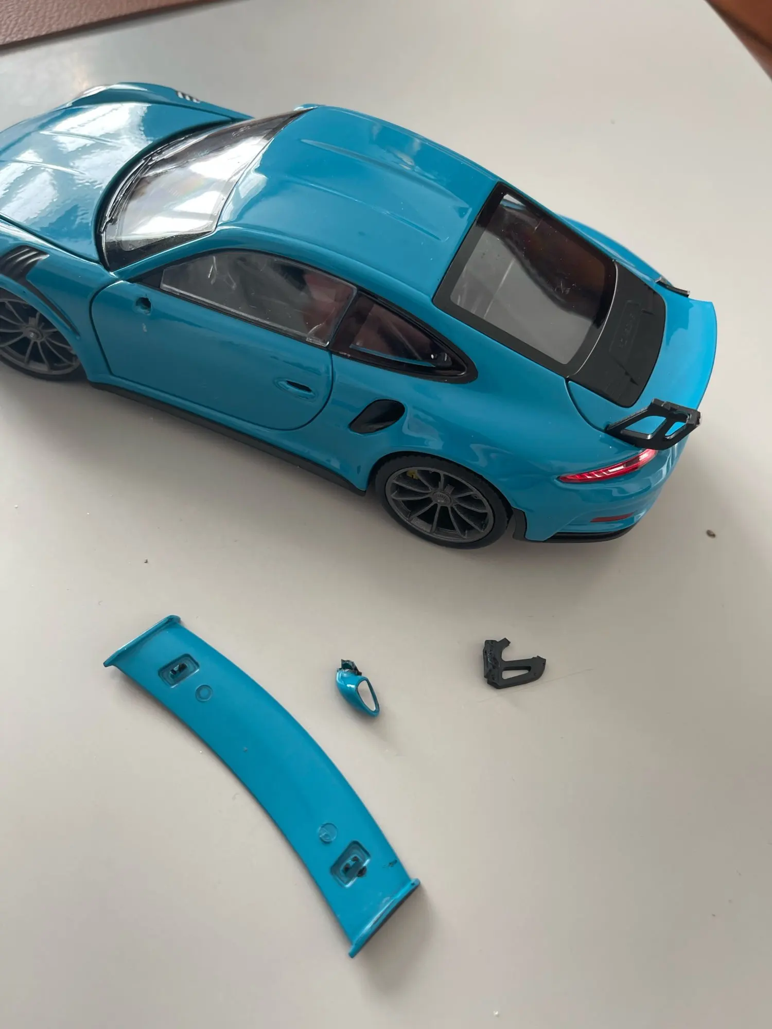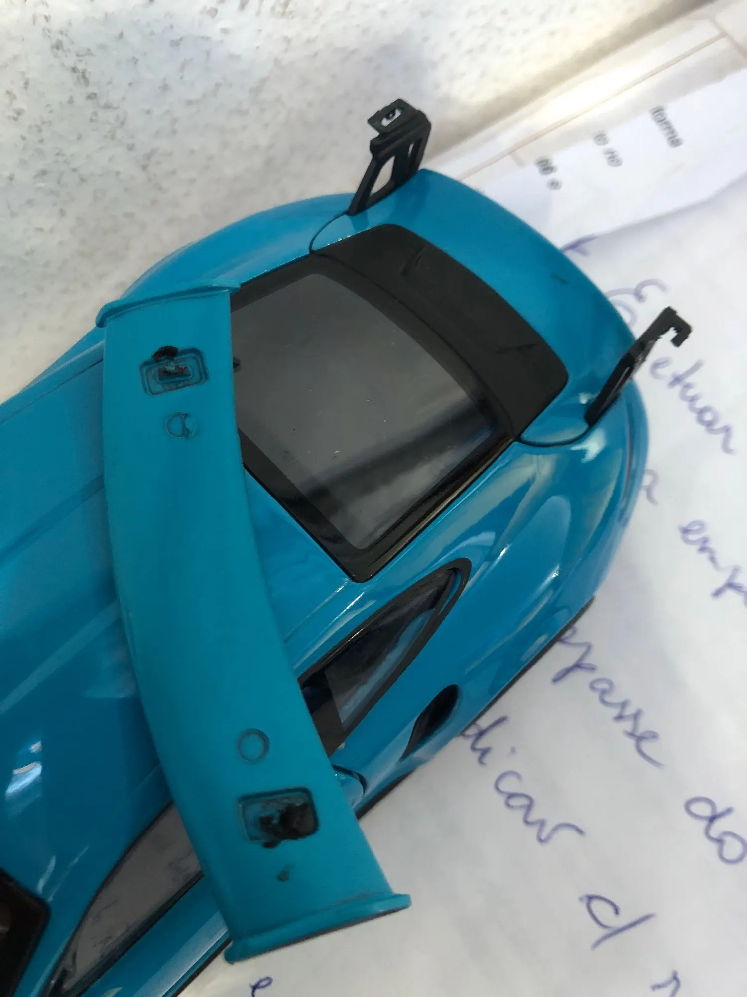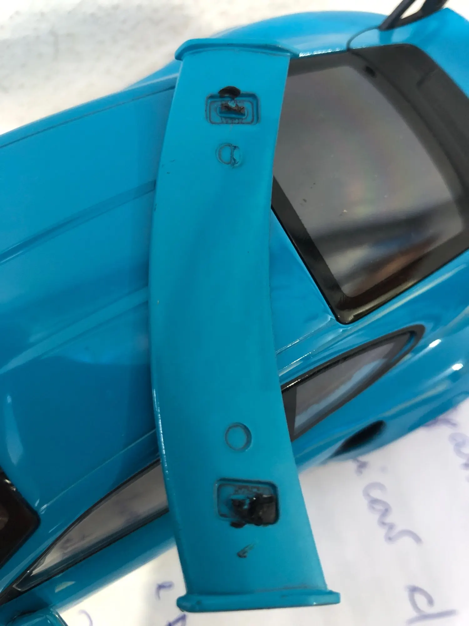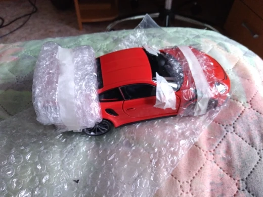 Несмотря на то, что продавец все упаковал хорошо, машина приехала с отломанным анти-крылом. Если бы модель была хорошо зафиксирована в пенопластовом контейнере, то такого возможно бы не произошло. Продавец предложил использовать клей...Такое себе решение, учитывая стоимость...