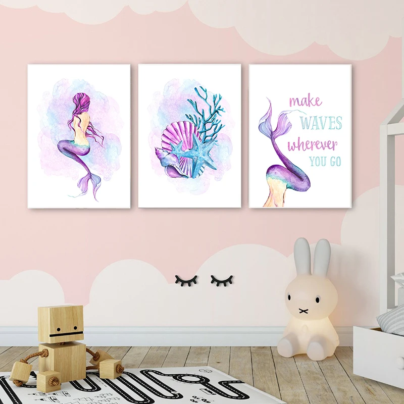 Современная Картина на холсте с изображением героев мультфильмов, Настенная картина розового цвета плакат с русалкой, для гостиной, спальни, для девочек, картина для украшения дома в скандинавском стиле