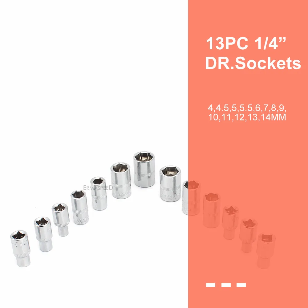 ① 1/4 "DR.Sockets: 4,4.5,5.5,6,7,8,9,10,11,12,13,14 мм -------- 13 шт. ② 1/4 "DR.Bit розетки: FD4,FD5.5,FD7,PH1,PH2,PH3,HW3,HW4,HW5,HW6,HW7,HW8,T10,T12,T20,T25,T30,T40,PZ1,PZ1,PZ3--------21PC ③ 1/4 "Dr глубокие розетки: 6,7,8,10,12,13,14MM--------7PC ④Hex ключ ключи, дюймовый стандарт: 1,5, 2,2.5MM--------3PC ⑤ 1/4 ”DR.Unviersal Joint ------- 1 шт 1/4 1/4 ”DR.Spinner Ручка: 6” -------- 1 шт 1/4 1/4 ”DR. Удлинитель: 2” и 4 ”-------- 2 шт 1/4 1/4 ”DR. Гибкое расширение: 6” -------- 1 шт. 1/4 1/4 "DR.Slioingt-Bar ------- 1 шт. DR 1/4 "DR.Bitadaptor ------- 1 шт. ⑪ 1/4 "DR. Трещотка ручной работы ------- 1 шт. Чехол-книжка из черного материала ------- 1 шт.