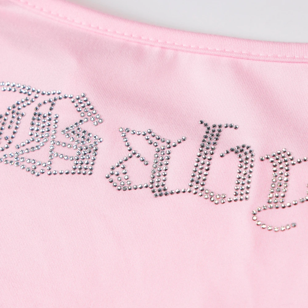Платье на бретелях с надписями, розовое короткое, стразы, лето 2000