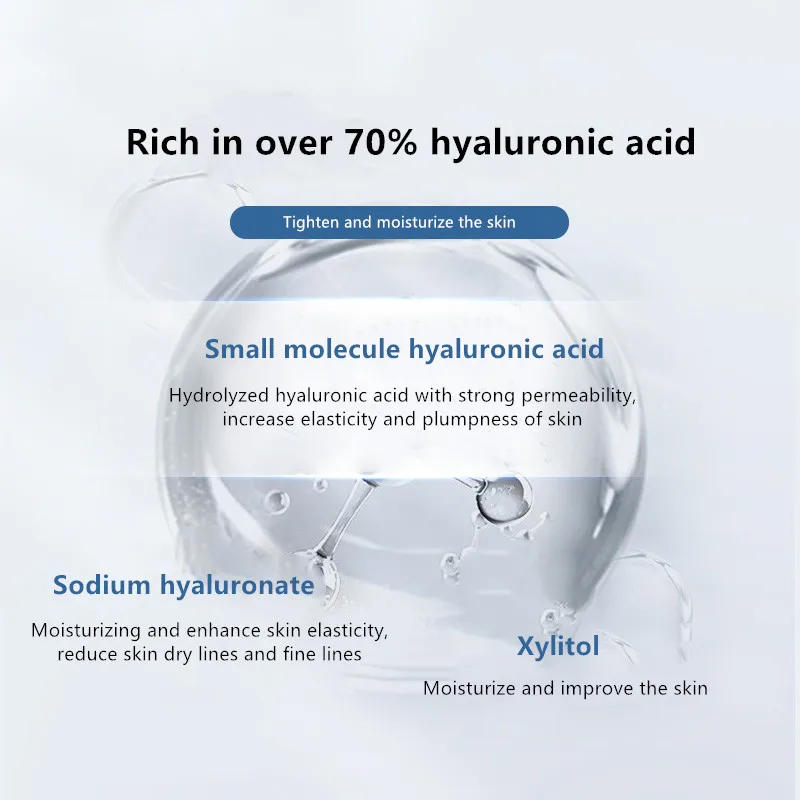 (1) небольшая молекула гиалуроновой кислоты: гидролизованная Гиалуроновая кислота с сильной проницаемостью, повышает эластичность и эластичность кожи(2) гиалуронат натрия: увлажняет и повышает эластичность кожи, уменьшает сухость кожи и тонкие линии(3) ксилит: увлажняет и улучшает кожу