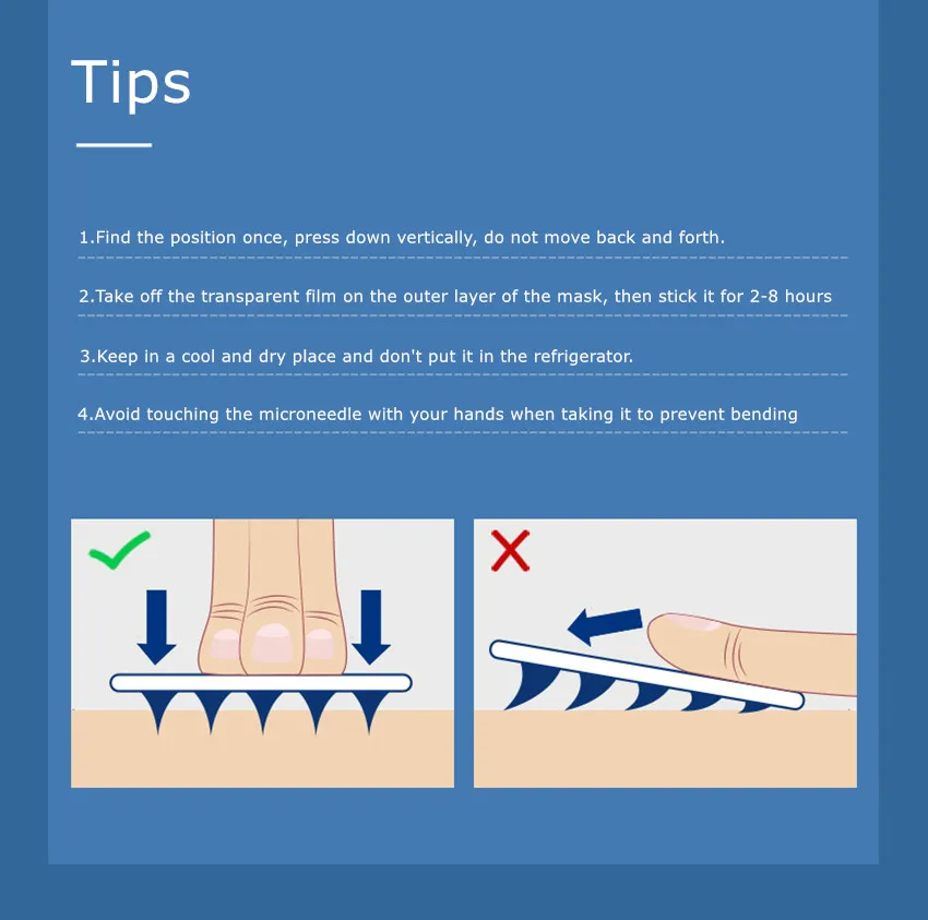 1. Найдите положение один раз, нажмите вниз вертикально, Не двигайтесь вперед и назад.2. Снимите прозрачную пленку на внешнем слое маски, затем приклейте ее в течение 2-8 часов.3. Хранить в прохладном и сухом месте и не помещать его в холодильник.4, не прикасайтесь к микро-игле руками, когда принимаете ее, чтобы предотвратить изгиб