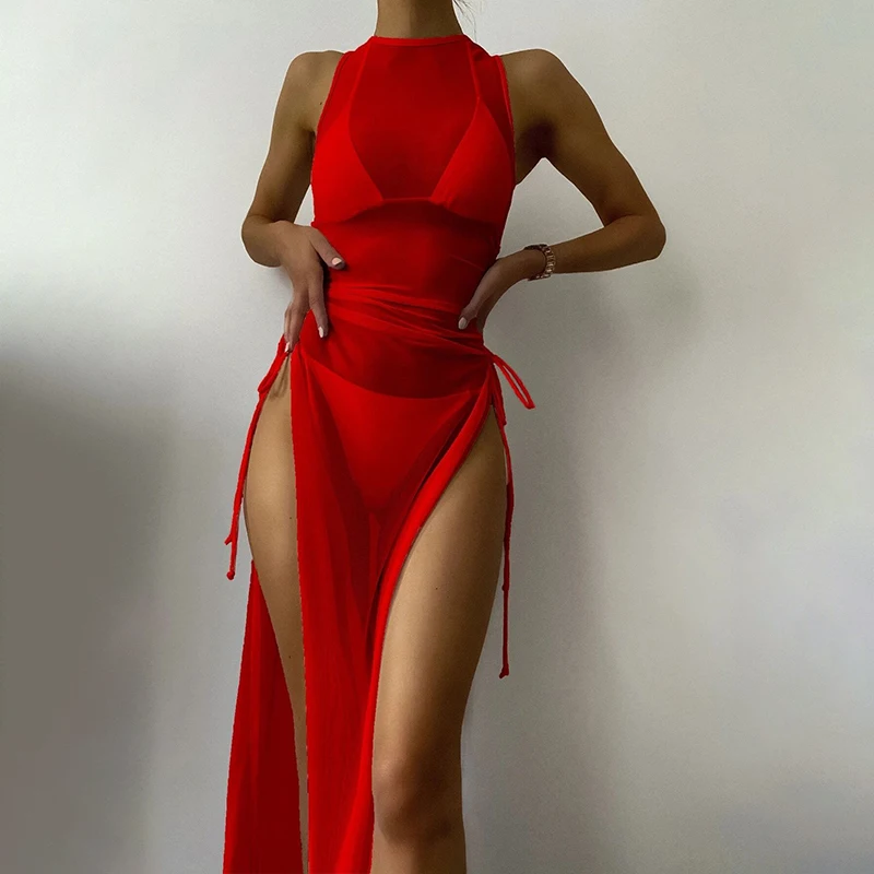 Melphieer 2021 костюм из трех предметов Бикини Верхнее нижнее Сетчатое красное пляжное платье длинная Пляжная накидка Женская одежда для плавания пляжная одежда для плавания