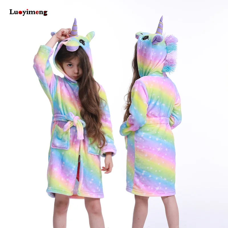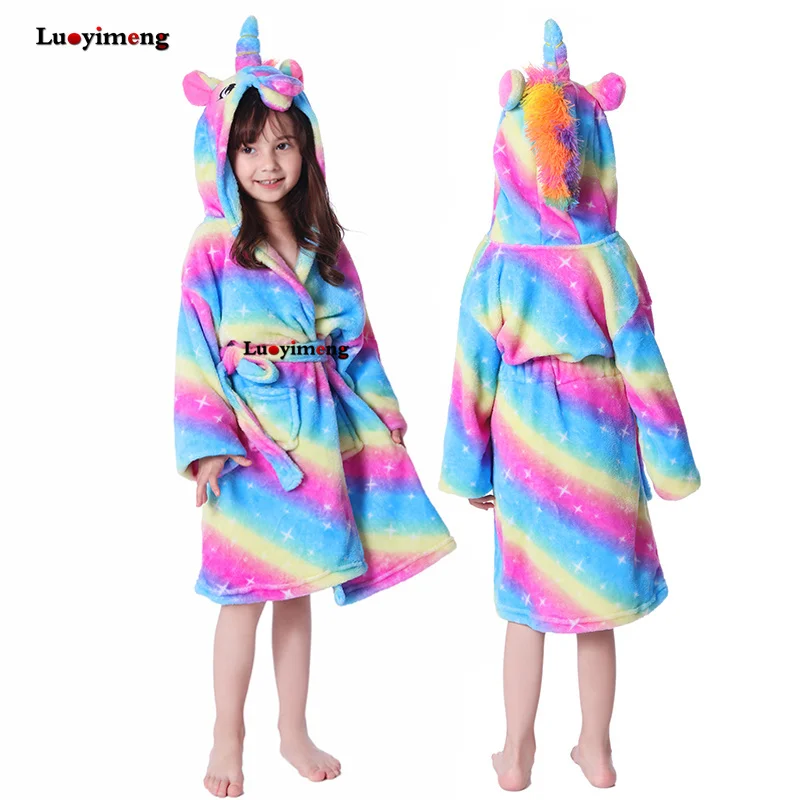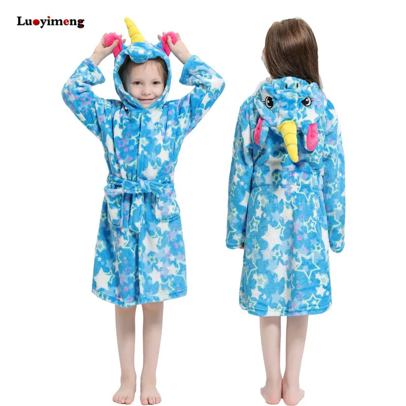 Зимние кигуруми с животными, Детские Банные халаты с единорогом, одежда для сна для мальчиков, детский халат, фланелевый Халат с капюшоном для девочек, пижамы