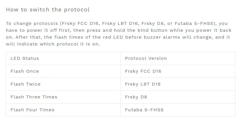 Поддерживает Frsky / Futaba / Bayang, пилоты могут легко изменить режим Futaba, Frsky D8, Frsky FCC D16 и Frsky LBT D16 через радиопередатчик.