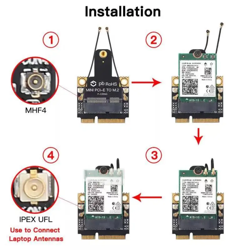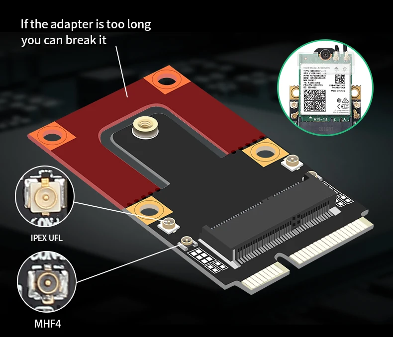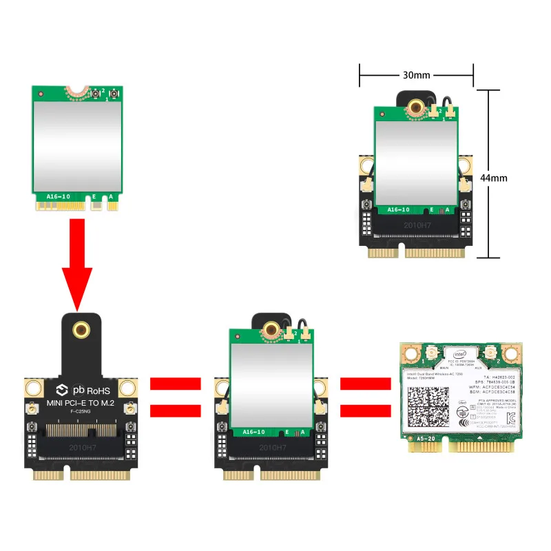 Используйте M.2 ключ E в мини конвертер PCI-E Простая установка Wifi карты, M.2 Wifi карты в полный размер PCI-E.M.2 Wifi карта до половины размера мини PCI-e беспроводная карта, она может заменить старый мини PCI-E Wifi карта в вашем lasptop.