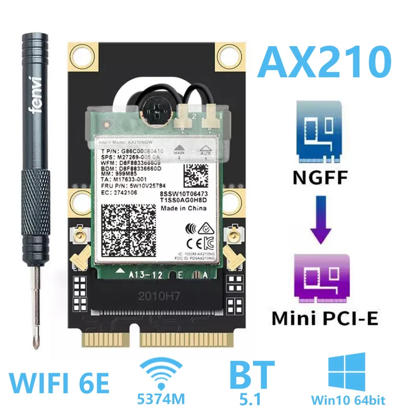 Модель: Wi-Fi 6 AX210;Интерфейс: Mini PCI-E;Двухдиапазонный: 2,4 ГГц/5 ГГц/6 ГГц (160 МГц);Скорость до 2400 Мбит/с (маршрутизатор должен быть на 160 МГц)(802.11ax);Поддержка Bluetooth 5,2;Поддержка Windows 10 64 бит;Поддерживаемые операционные системы: работает только на Windows 10*64 бит; Linux;Примечание: не поддерживает Windows 7/8/8.1.Совместимость с:Он может использоваться на Samsung/Dell/Sony/ACER/ISUS/MSI/Clevo/Terransforce/Hasee и т. Д.Не поддерживает Ноутбук IBM/Thinkpad/lenovo/hp. (но для ноутбука HP/Lenovo 2016 выше, он может поддерживать.)