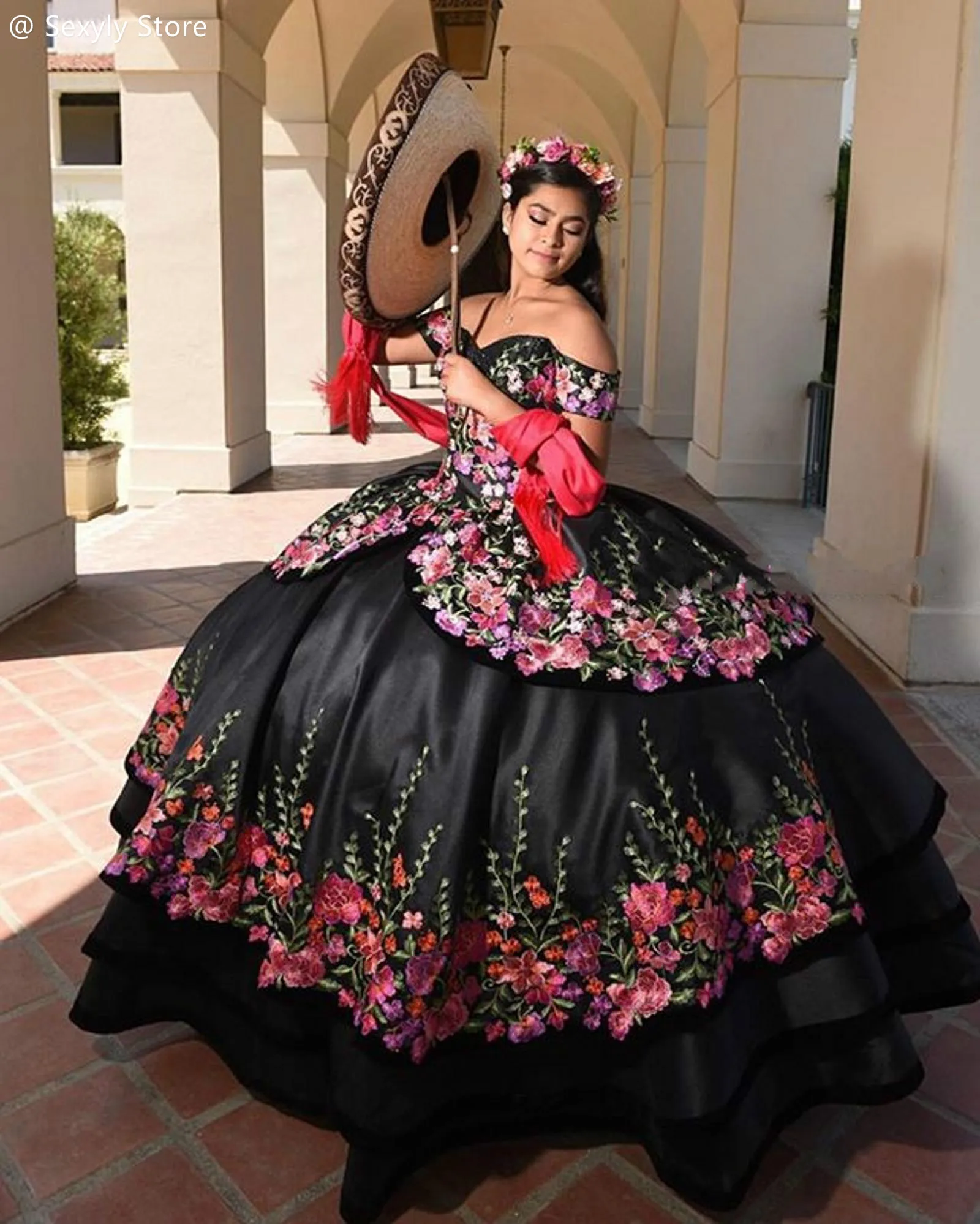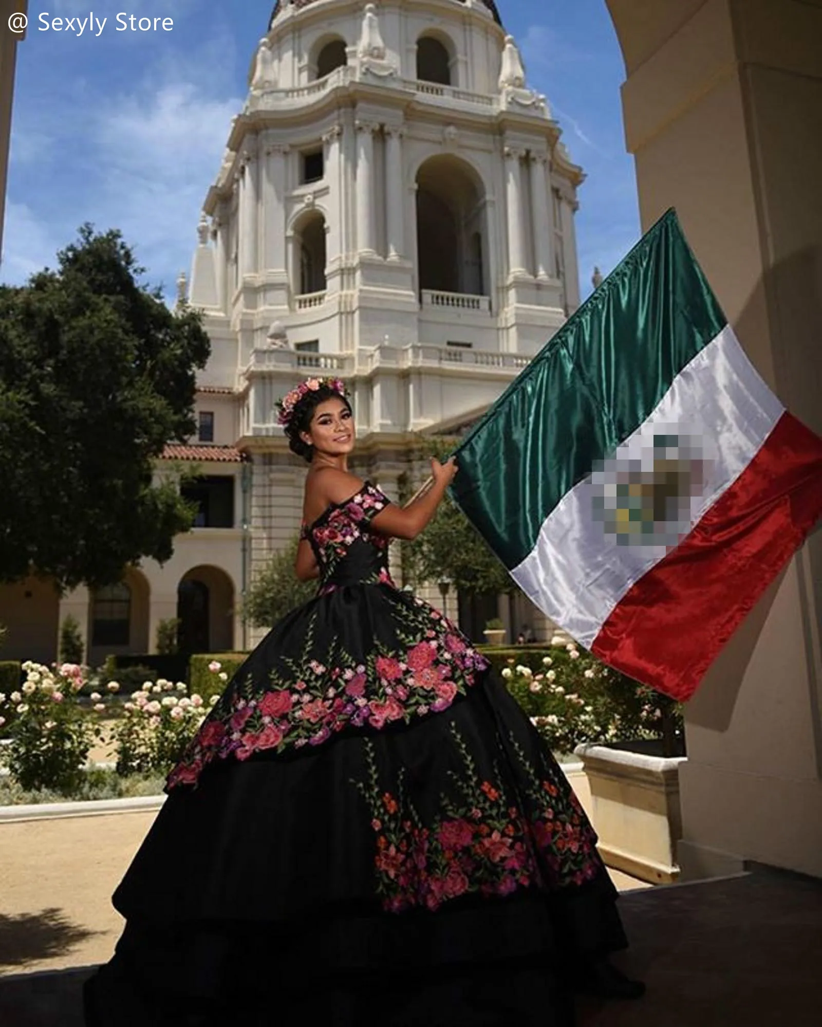 Черные мексиканские платья принцессы для Quinceanera 2020 с коротки...