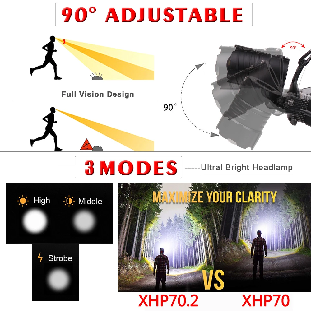Налобный фонарь, светодиодный XHP-70.2 с 3 режимами работы, 18650