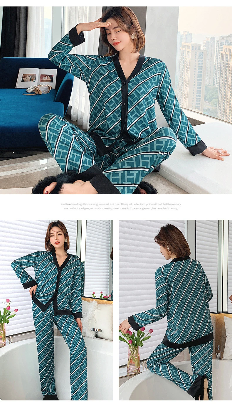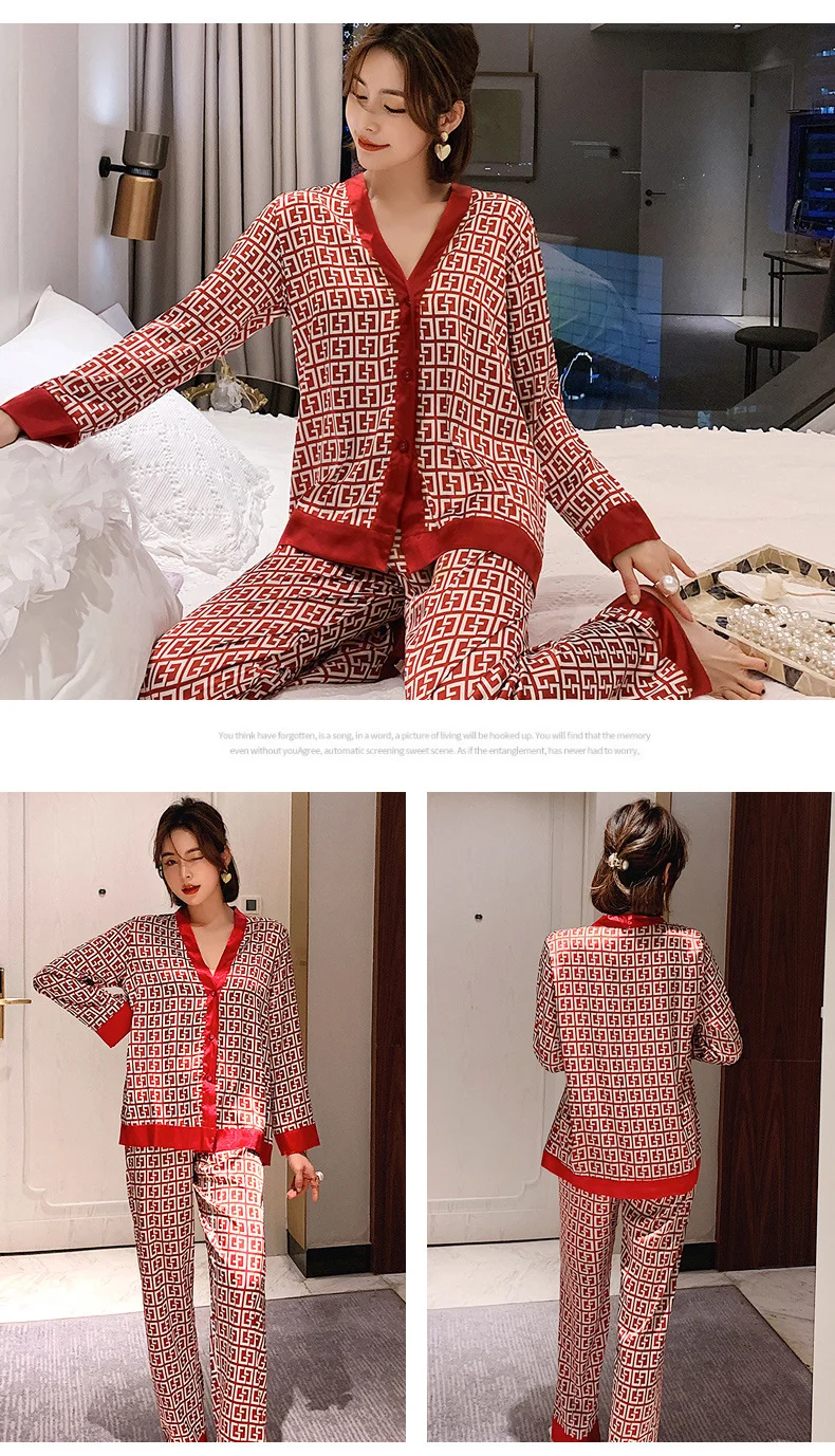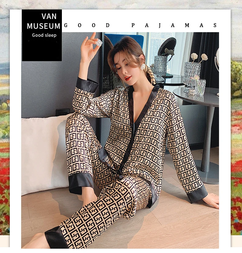 Женский атласный комплект одежды для сна-Топ с длинными рукавами и v-образным вырезом + длинные штаны-С классическим принтом-Материал: полиэстер/эластан-Мягкий и гладкий на ощупь