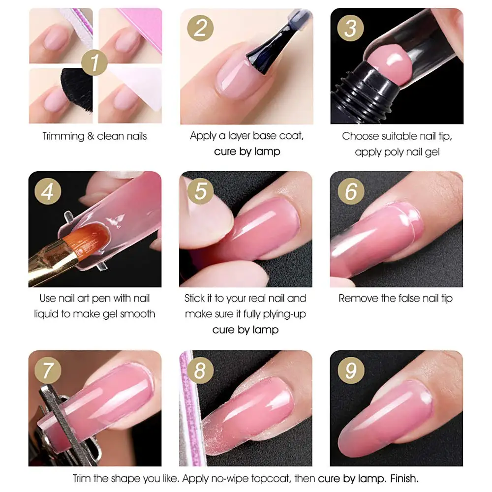 1. Используйте пилку для ногтей, чтобы потереть поверхность ногтя, а затем очистить ногти;2. Нанесите тонкий слой базового геля, полимеризация светодиодной или УФ-лампой 30-60 с;3. Выберите подходящие кончики для нанесения полигеля, используйте кисть для ногтей с раствором скольжения, чтобы сделать гель гладким;4. Положите его к ногтю, отверждения с led или УФ-лампой 30-60s;5. Снимите Кончики ногтей, обрежьте форму и отполируйте ногти;6. Нанесите тонкий слой без протирания верхнего покрытия, отверждения с помощью светодиодной или УФ-лампы 30-60s;