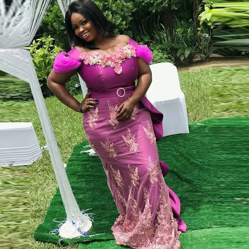 Фуксия размера плюс Выпускные платья с открытыми плечами, Детская куртка с цветочной аппликацией Русалка Вечерние платья Кружево Appliqes в африканском стиле на высоком каблуке под вечернее платье