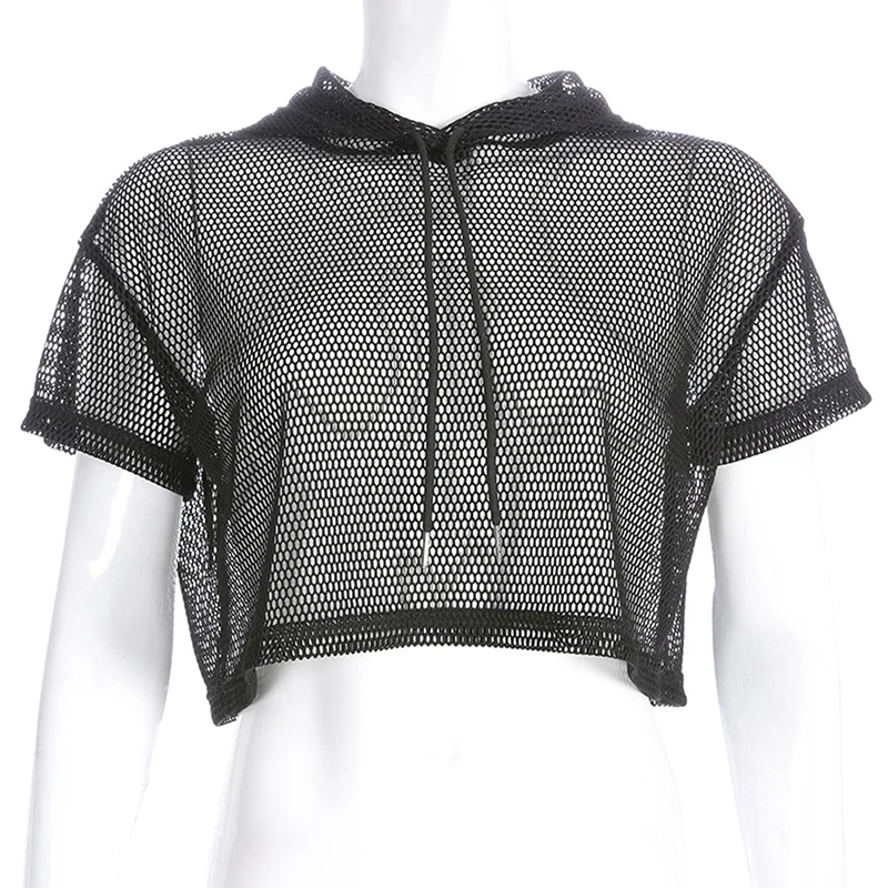 Футболка с короткими рукавами для женщин сетчатый топ с капюшоном с вырезами пикантные шорты в стиле панк-рок укороченный топ белая футболка в сеточку черного цвета