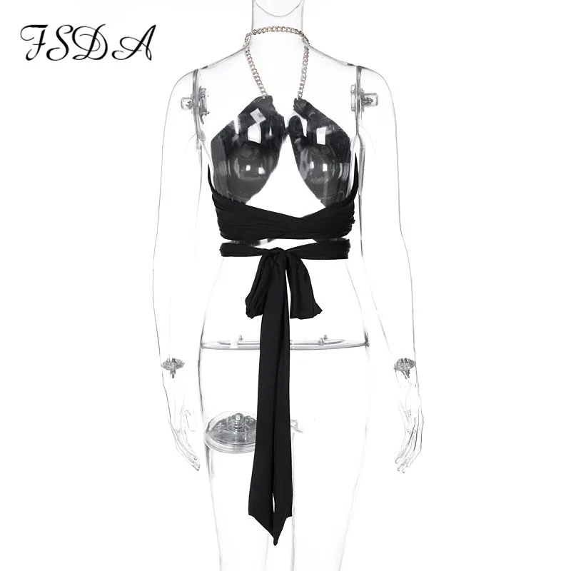 Летний черный сексуальный укороченный топ FSDA, Женский бандажный топ с лямкой на шее, открытой спиной и открытыми плечами, вечерние топы без рукавов с вырезами